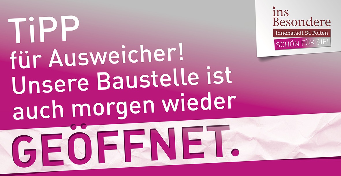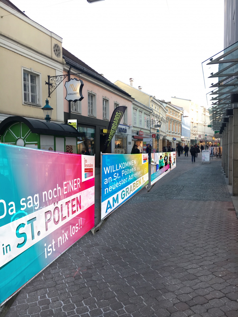 Neben Inseraten im St. Pölten Konkret etc. sollen vor allem die Baustellengitter werblich bespielt werden. Transparente sollen gestaltet werden.
